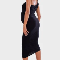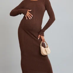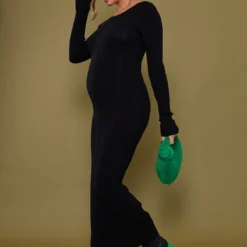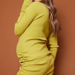 Zero Maternité Robe De Grossesse Moulante Chartreuse Côtelée à Manches Longues Et Devant Froncé
