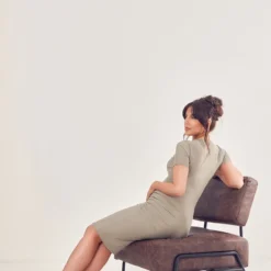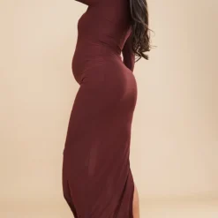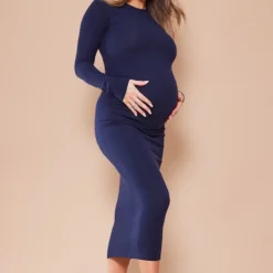 Maternité Robe De Grossesse Mi-longue Ajustée Gris Foncé En Maille Côtelée Douce à Manches Longues