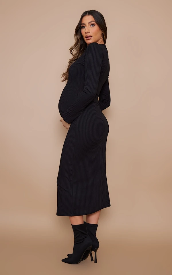 Maternité Robe de grossesse mi-longue côtelée noir foncé à manches longues