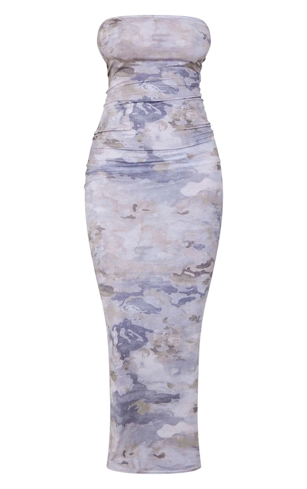 Trop de flow avec cette robe bustier ! On crush sur sa coupe longue, sur sa couleur grise canon et sur son design à imprimé camouflage à couper le souffle. Portée avec une paire de talons argentés et des bijoux, elle vous assure un look de soirée au top !