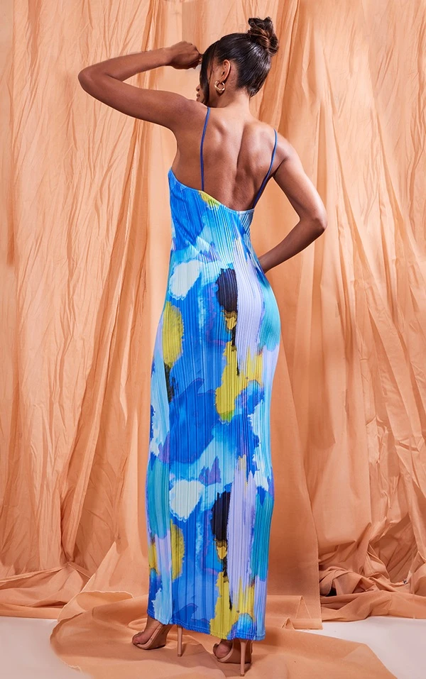 Robe longue bleue imprimé abstrait plissée à bretelles et dos échancré