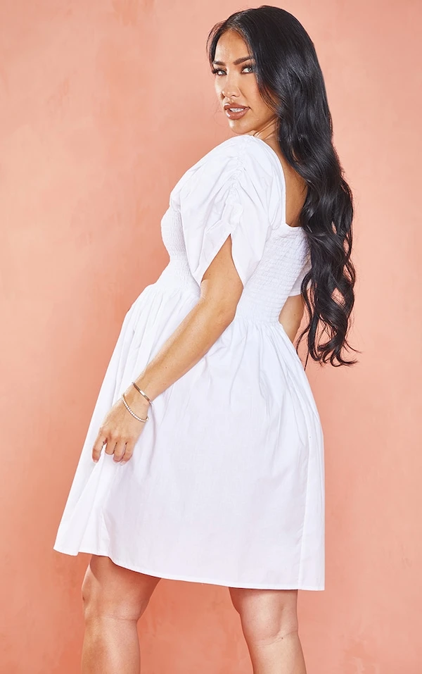Maternité Mini robe babydoll de grossesse blanche froncée sur le buste