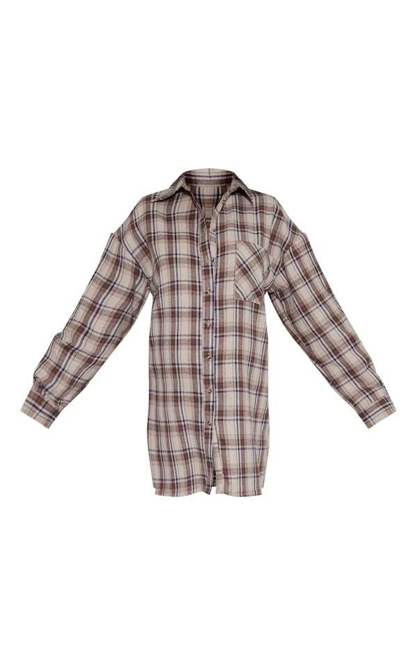 Maternité Robe chemise de grossesse brossée marron à carreaux en flannelle oversize à ourlet incurvé