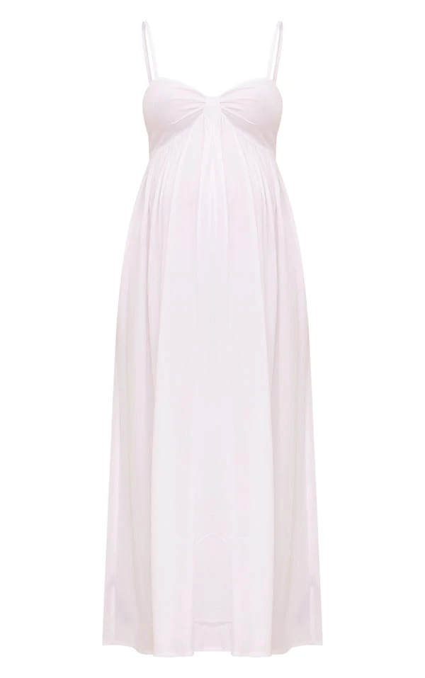 Maternité Robe de grossesse longue blanche en étamine à bretelles et détail bonnets