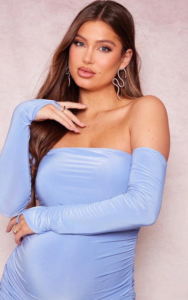 Maternité Robe de grossesse longue moulante bleue froncée à épaules dénudées