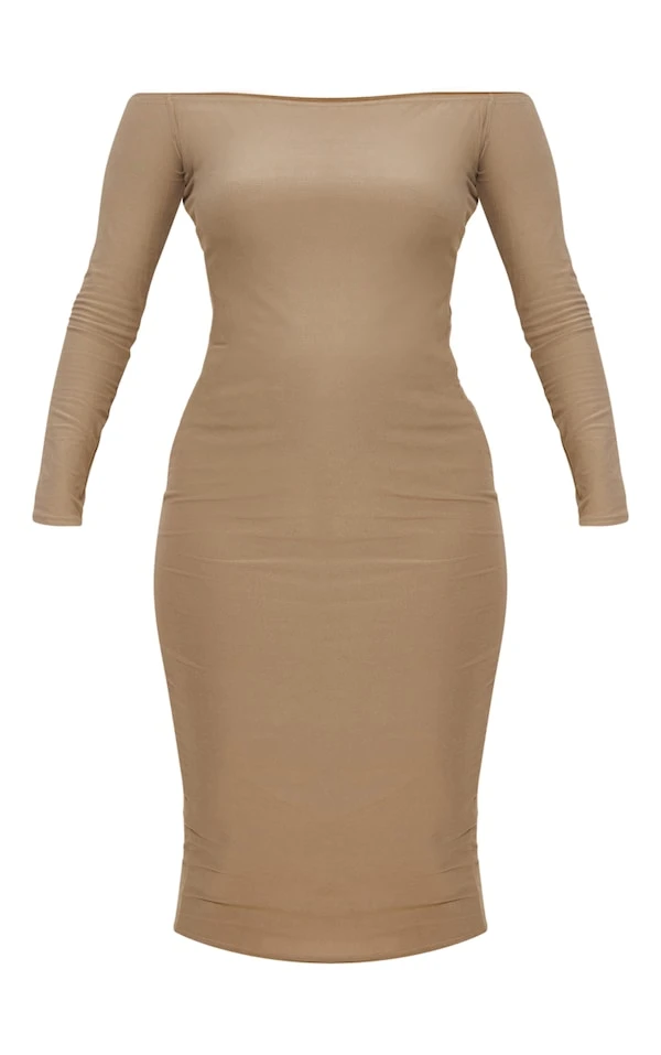 Maternité Robe de grossesse mi-longue douce taupe à épaules dénudées