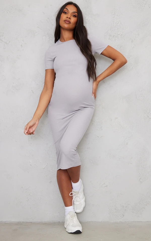 Maternité Robe de grossesse mi-longue gris chiné côtelée à col rond