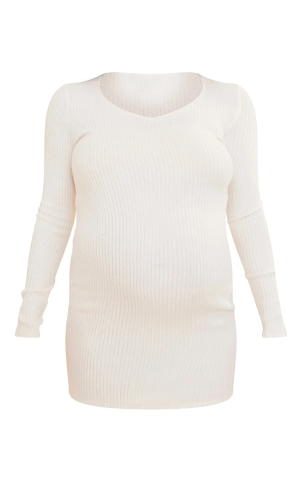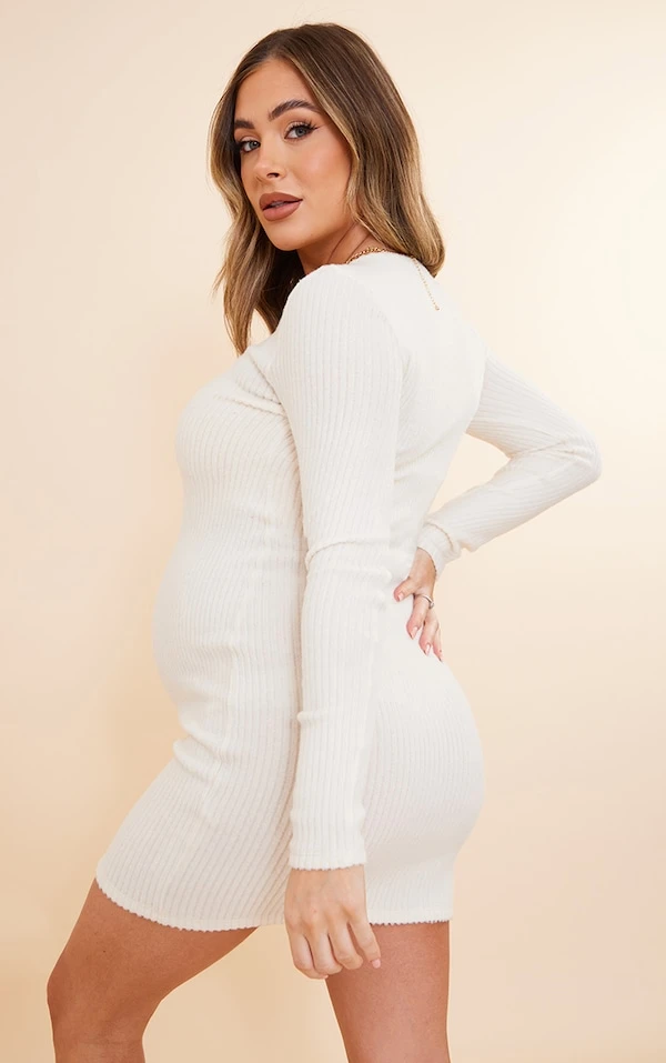 Maternité Robe de grossesse moulante crème en maille côtelée brossée à décolleté