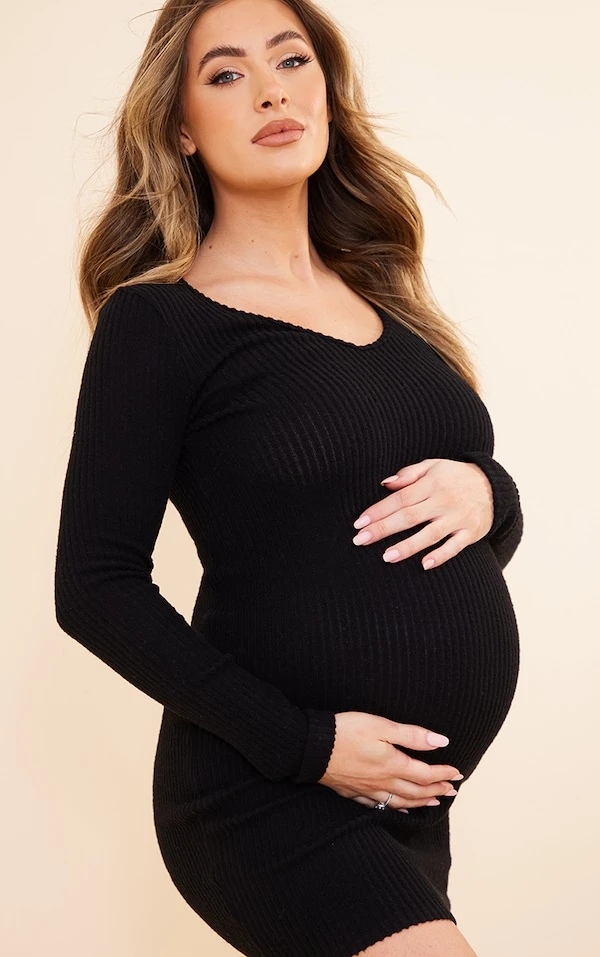 Maternité Robe de grossesse moulante noire en maille côtelée brossée à décolleté
