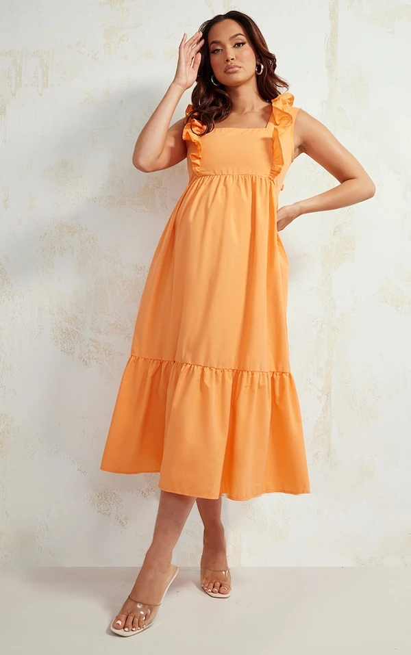 Sublime dans cette robe de grossesse ! Sa couleur orange attire tous les regards et on adore son effet volanté et son design sans manches. Pour un look qui met votre petit ventre en valeur, elle se porte avec une paire de baskets et une veste oversize. Maman canon à l’approche !