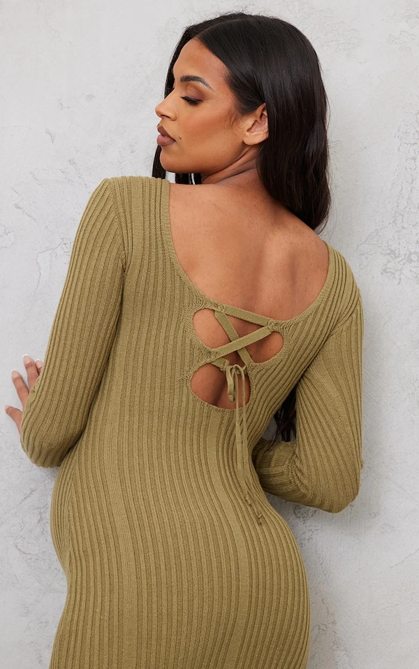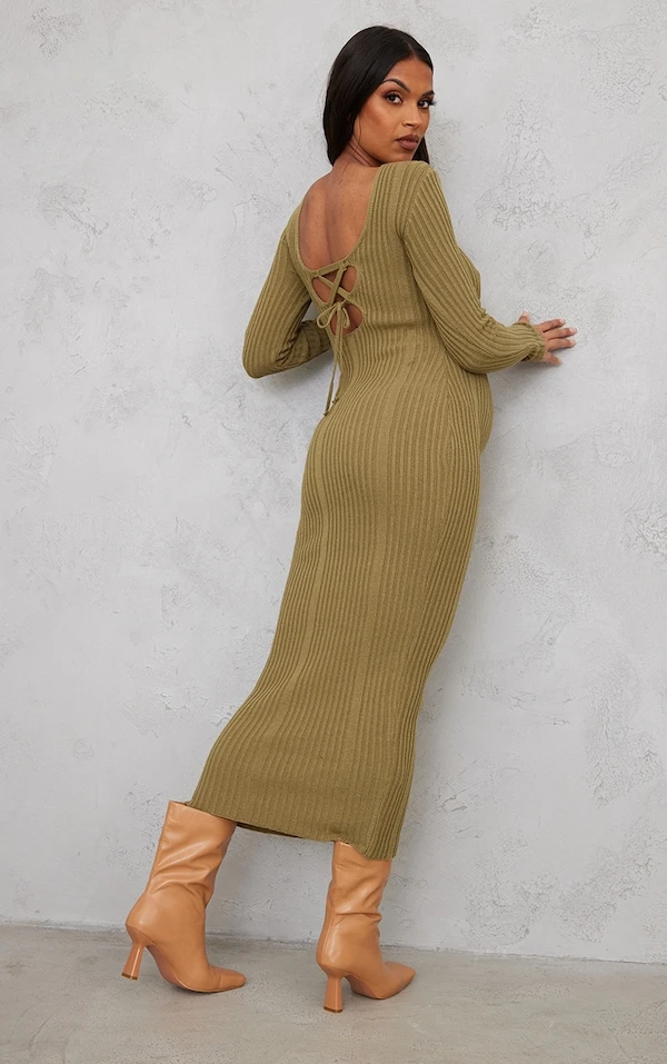 Maternité Robe moulante de grossesse longue en maille tricot kaki à nouer derrière