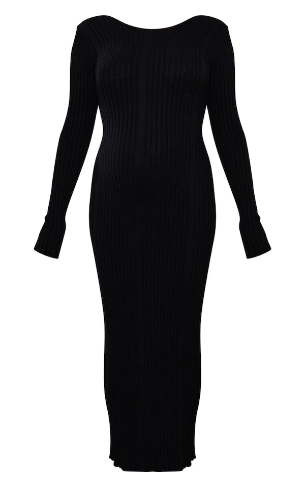 Maternité Robe moulante de grossesse longue en maille tricot noire à nouer derrière