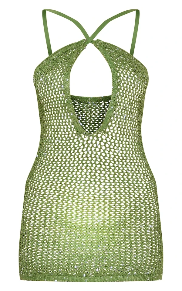 Mini robe en crochet vert olive à sequins et bretelles
