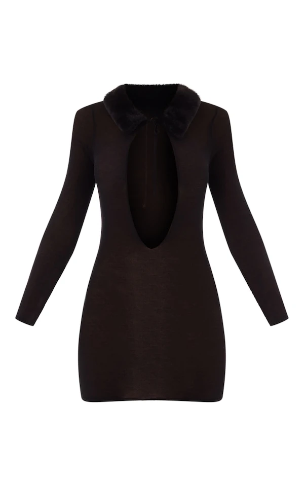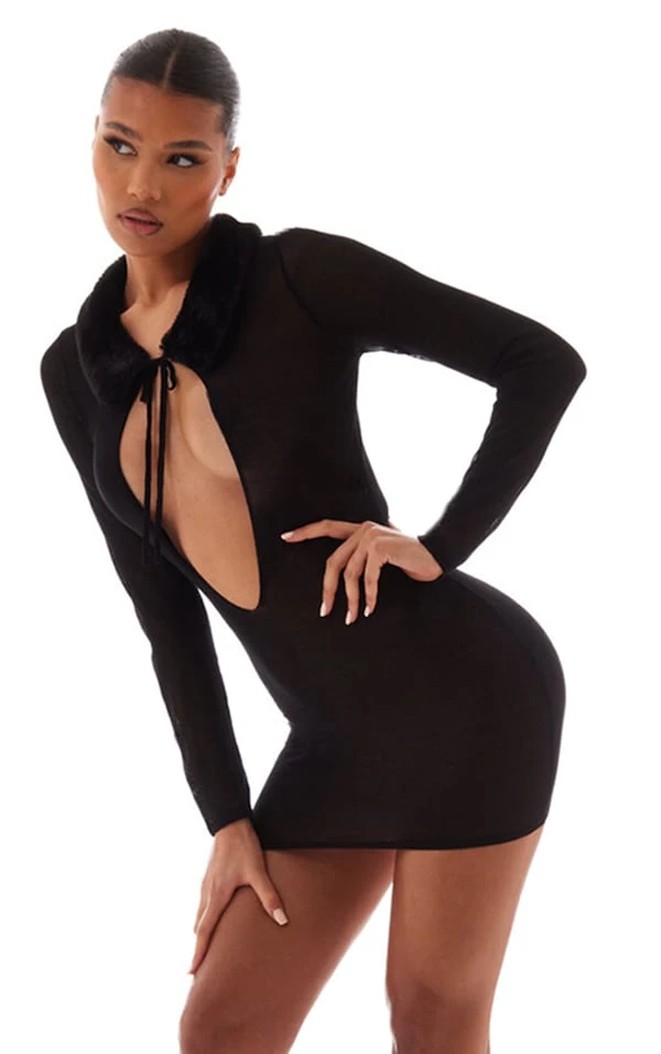 Magnifique cette robe à la coupe mini ! On adore sa maille tricot au style transparent, son coloris noir qui va avec absolument tout et son design à col en fausse fourrure hyper stylé. Plus qu’à ajouter une paire de talons lacés et quelques accessoires. Tellement belle !