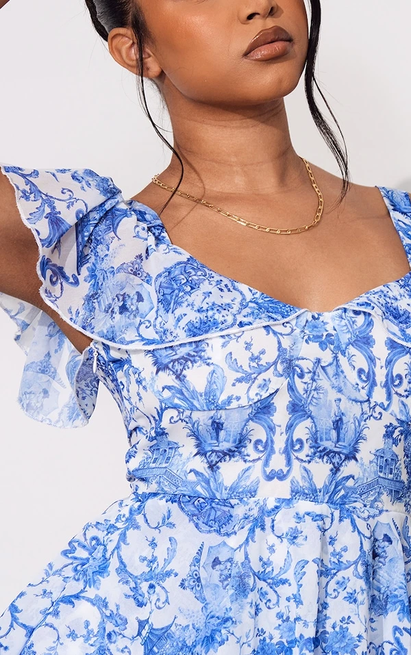 Petite Mini robe bleue en mousseline de soie imprimé à volants