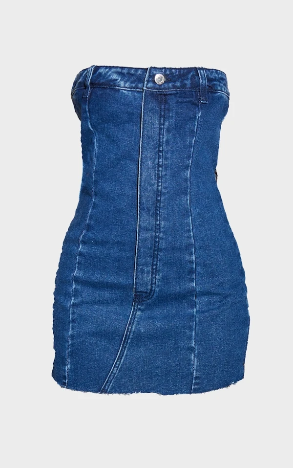 Petite Mini robe bustier en jean bleu moyennement délavé