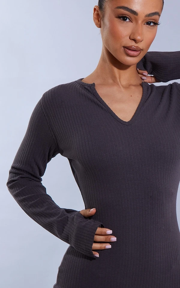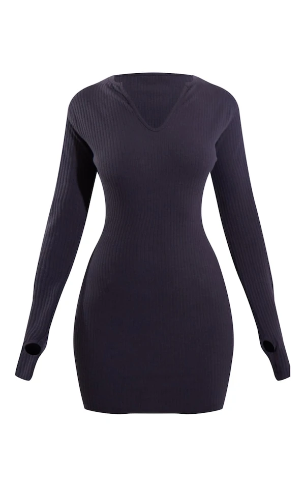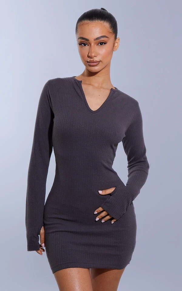 Petite Mini robe côtelée gris anthracite à manches longues et trous pour les pouces