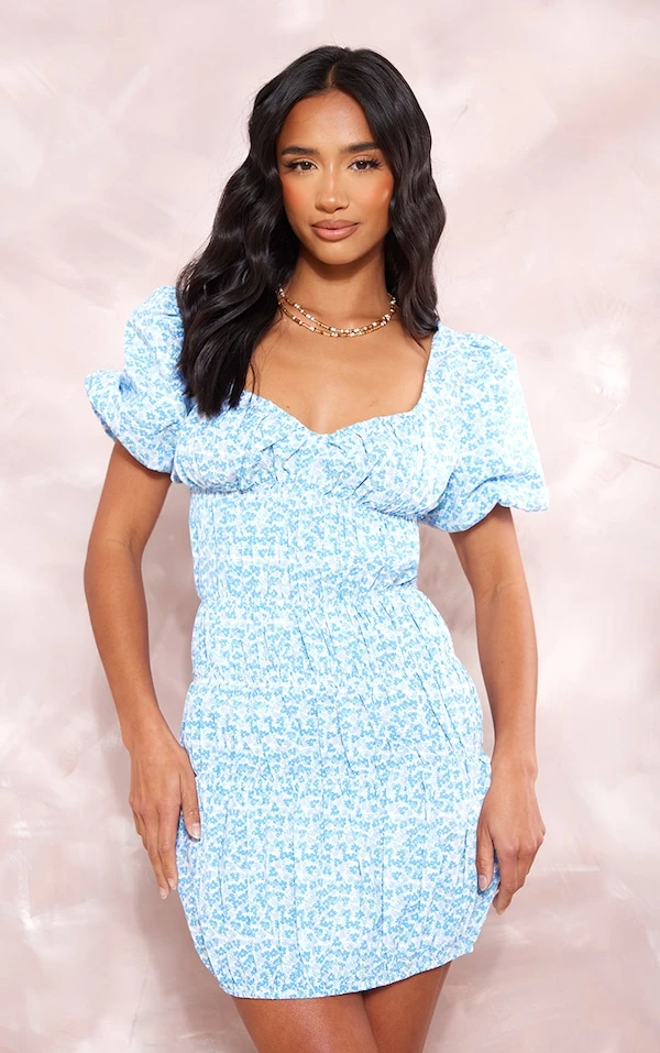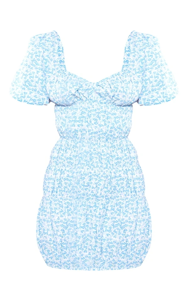 Petite Mini-robe fleurie bleu à manches bouffantes