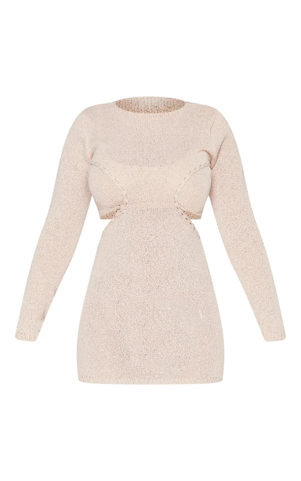 Petite Mini robe moulante en maille tricot gris pierre à découpes
