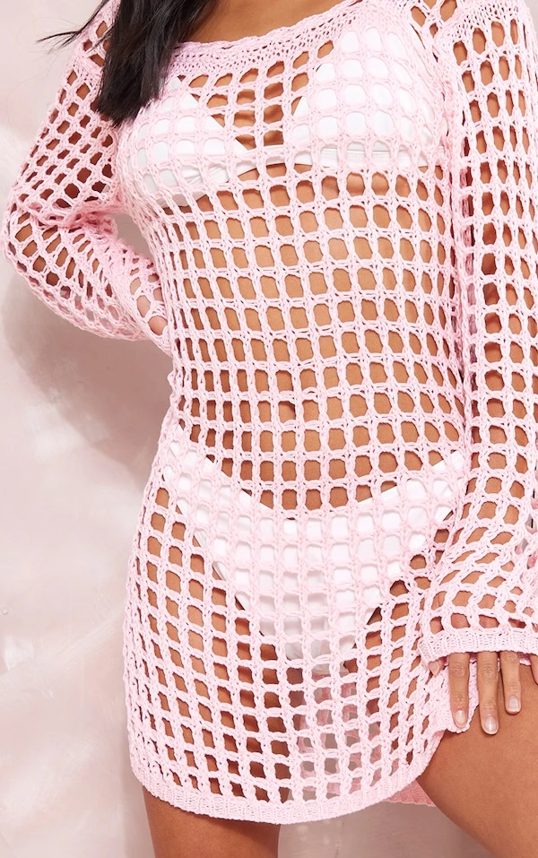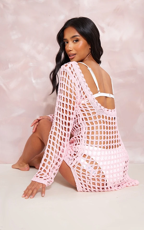 Petite Mini-robe rose en maille tricot ajourée