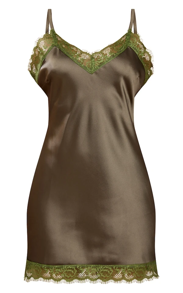 Petite Robe à fines bretelles satinée vert olive à bordures en dentelle