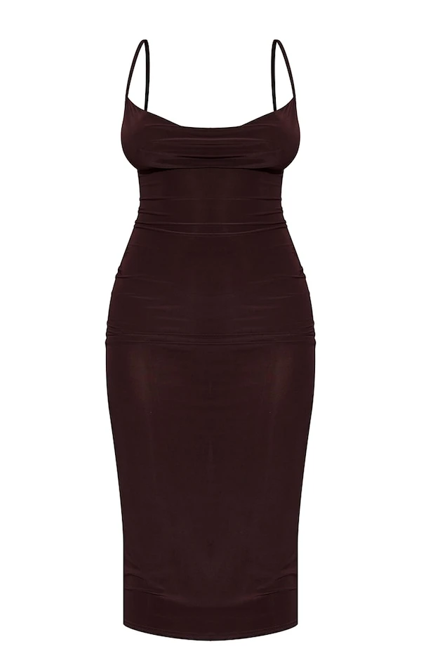 Tellement canon cette robe longue ! Avec son marron chocolat, sa matière slinky et son design minimal, elle nous a fait craquer. Il ne manque qu’une paire de talons !