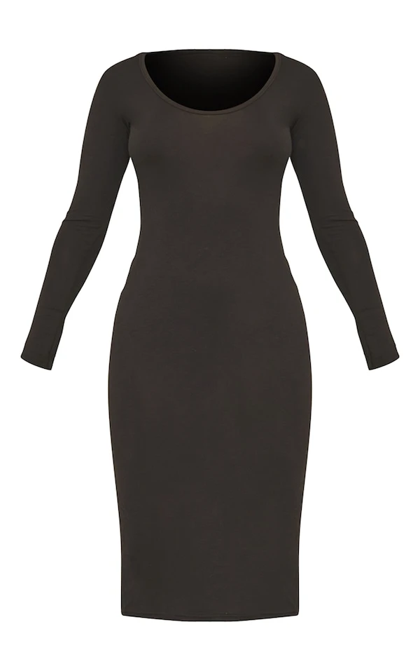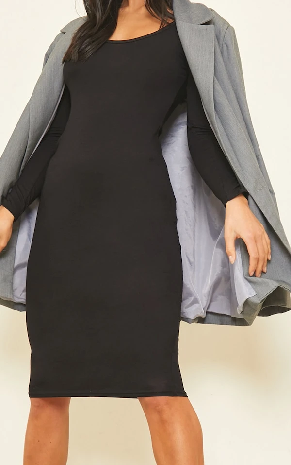 In love de cette robe noire! Elle est chic et sexy à la fois avec sa coupe mi-longue, moulante et à manches longues. On la porte avec des talons pour un look minimal chic.