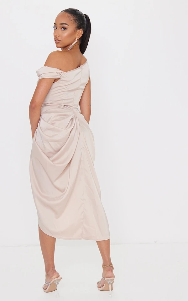 Petite Robe mi-longue satinée champagne à épaules dénudées et jupe drapée