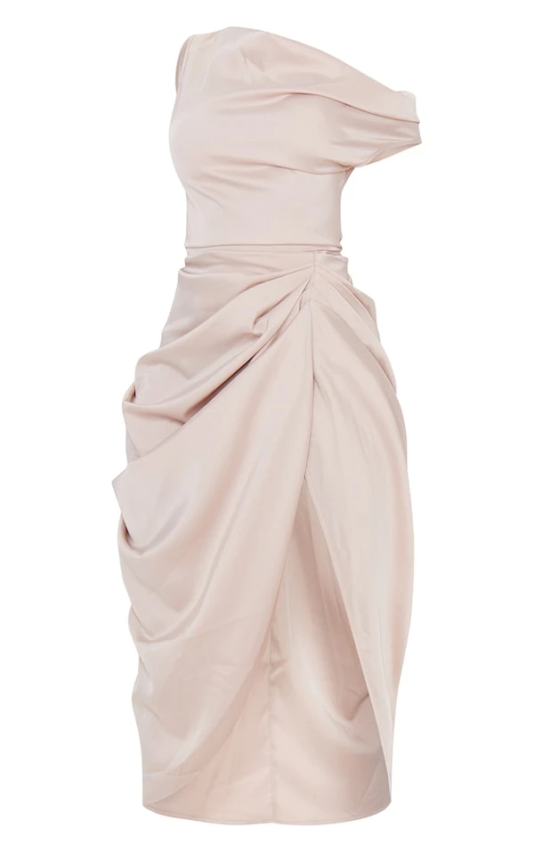 Absolument glam dans cette robe à la coupe mi-longue. Dans son satiné canon et luxe, son coloris champagne et son design à épaules dénudées et jupe drapée, c’est un crush immédiat.