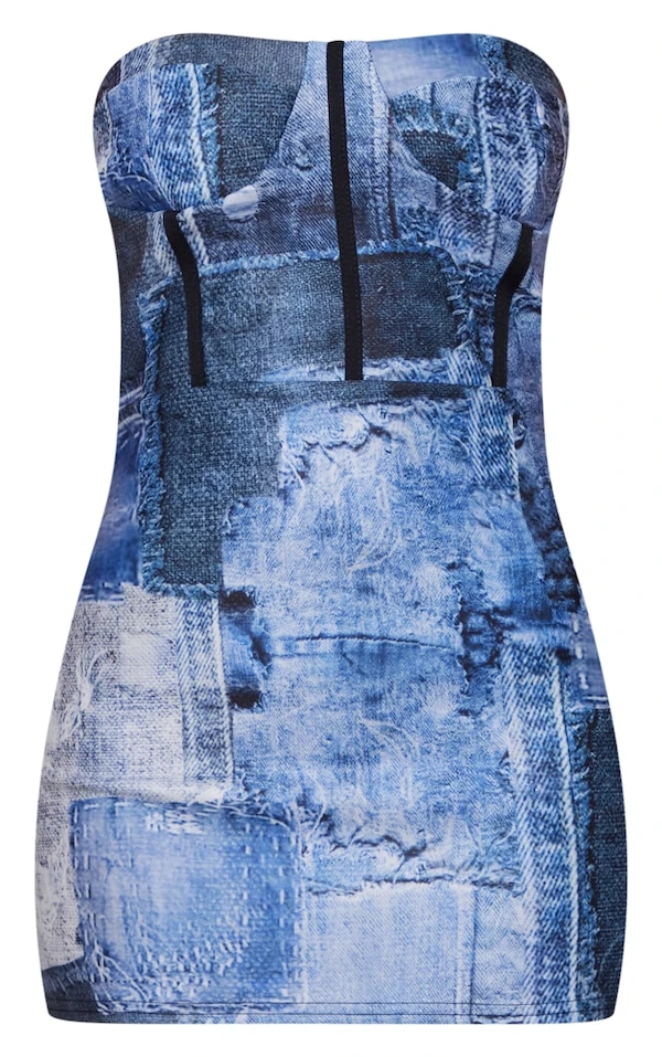 Petite Robe moulante bleue imprimé journal à détail corset