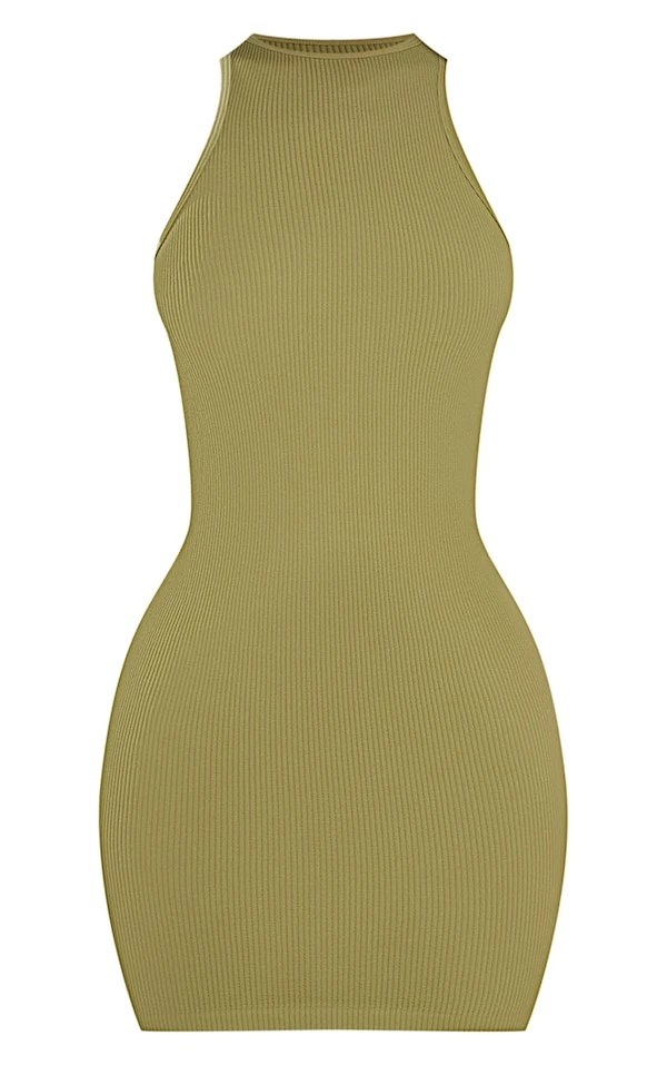 Petite Robe moulante côtelée vert sauge à dos nageur et détail contours
