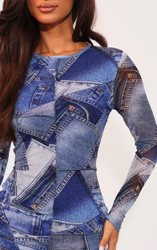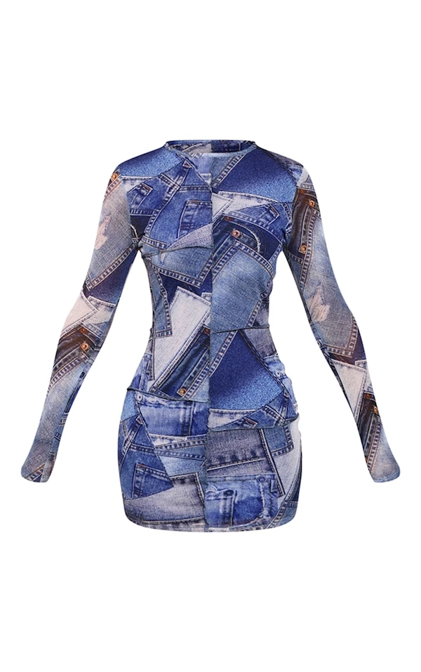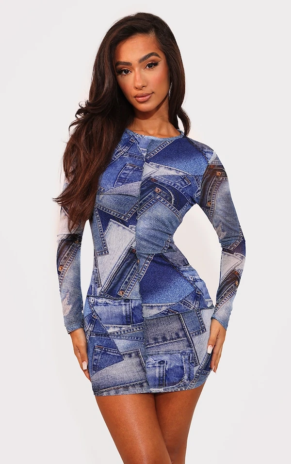 Petite Robe moulante imprimé jean bleu à empiècements contrastants