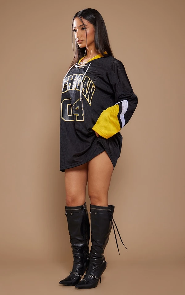 En mode NBA avec cette robe t-shirt basketball ! Son coloris noir infaillible et son design à manches longues nous ont charmées direct. Elle se porte avec des bottes montantes en similicuir noir pour jouer sur les styles. Trop simple pour vous !