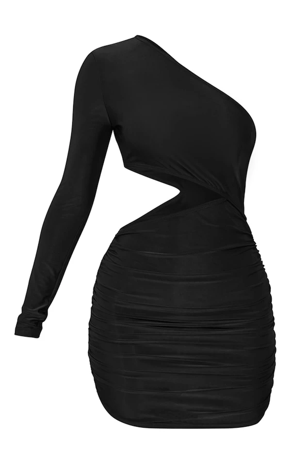 Petite Robe très moulante froncée noire asymétrique découpée à la taille