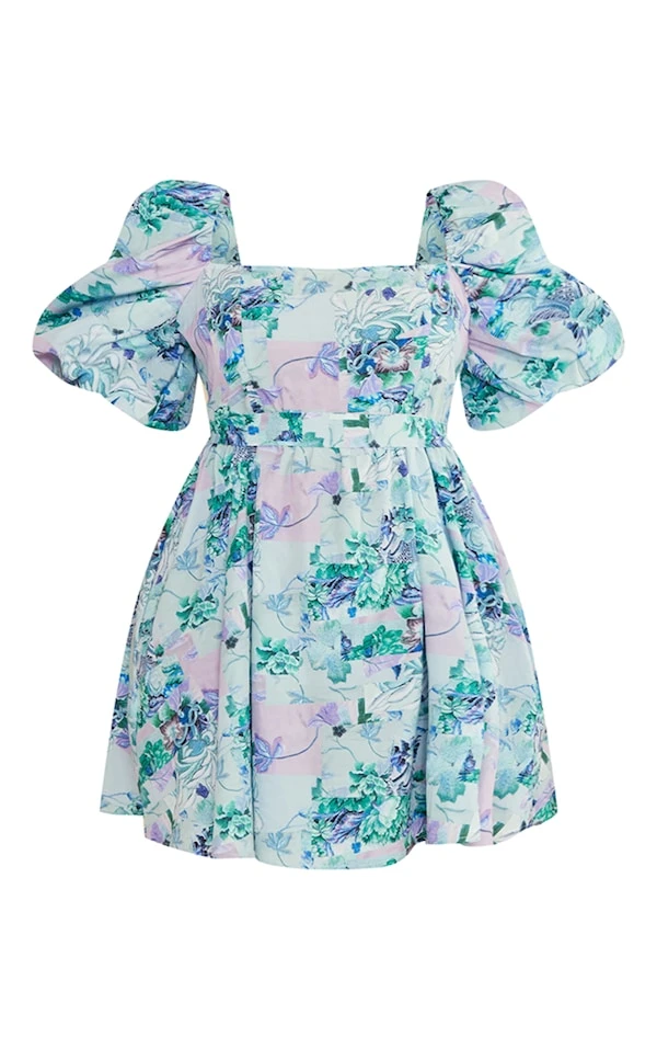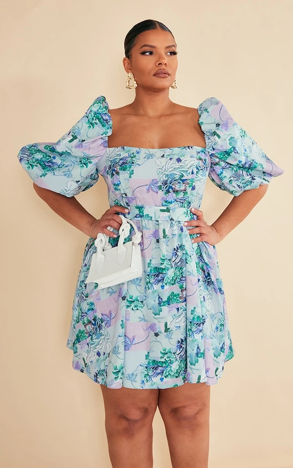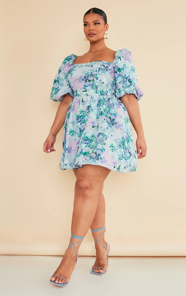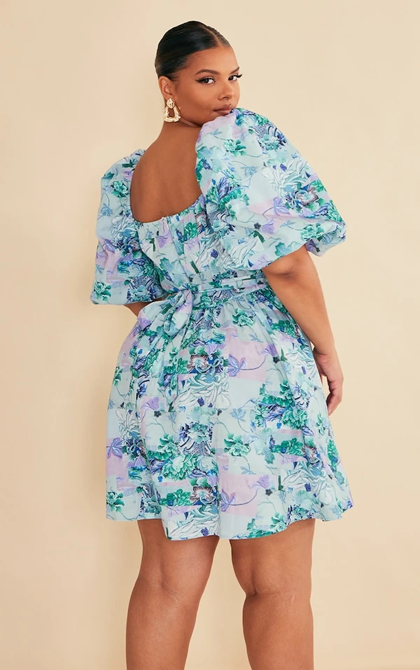 Plus Robe bouffante nouée à la taille fleurie bleue