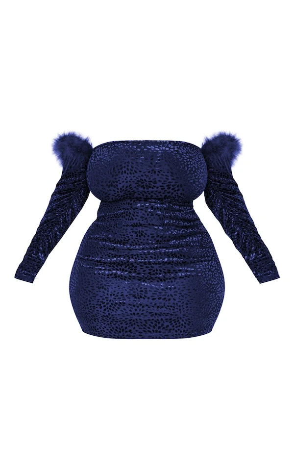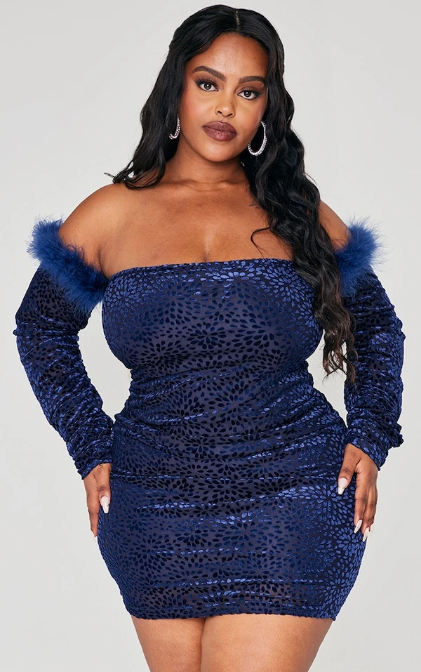 Plus Robe bustier bleu marine dévorée à épaules dénudées et bordure en fausses plumes