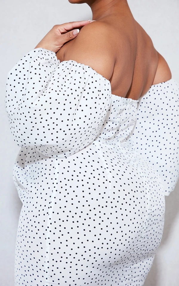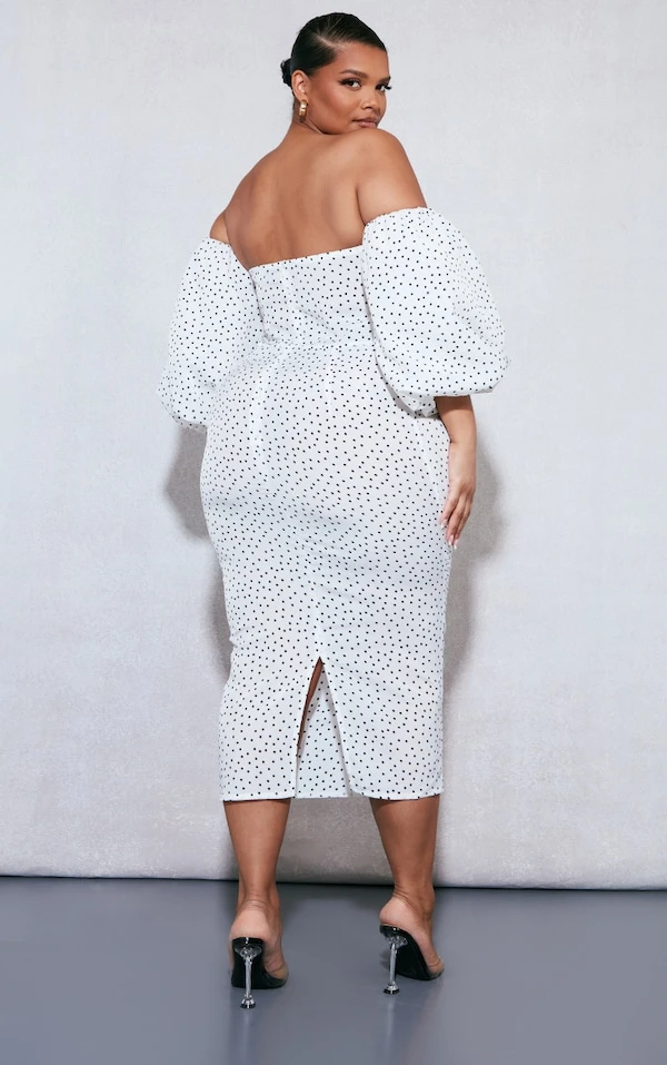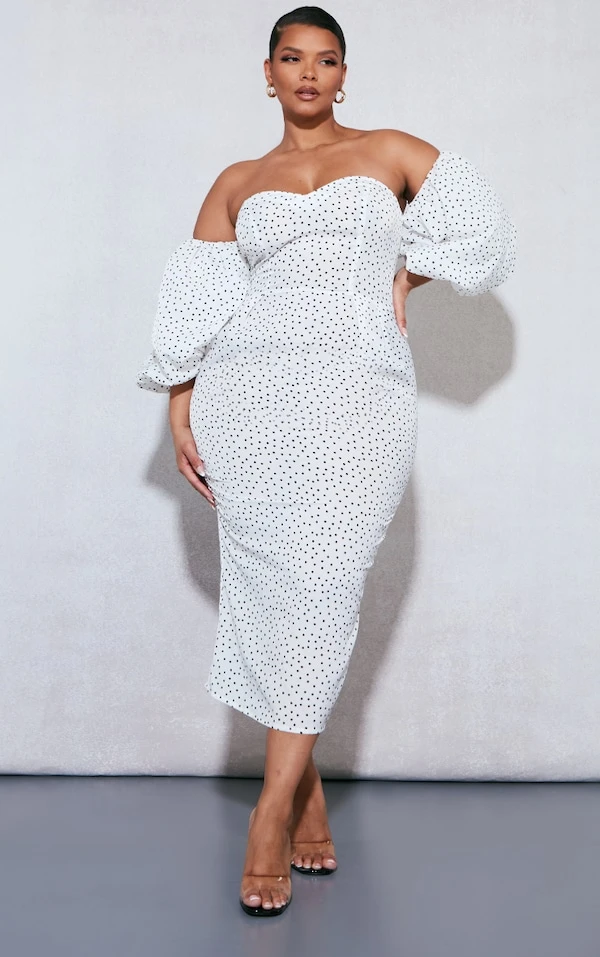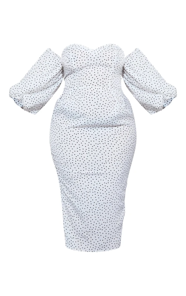 Plus Robe bustier mi-longue blanche à pois et manches bouffantes