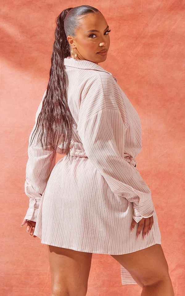 Plus Robe chemise de plage oversize côtelée beige à rayures et taille nouée