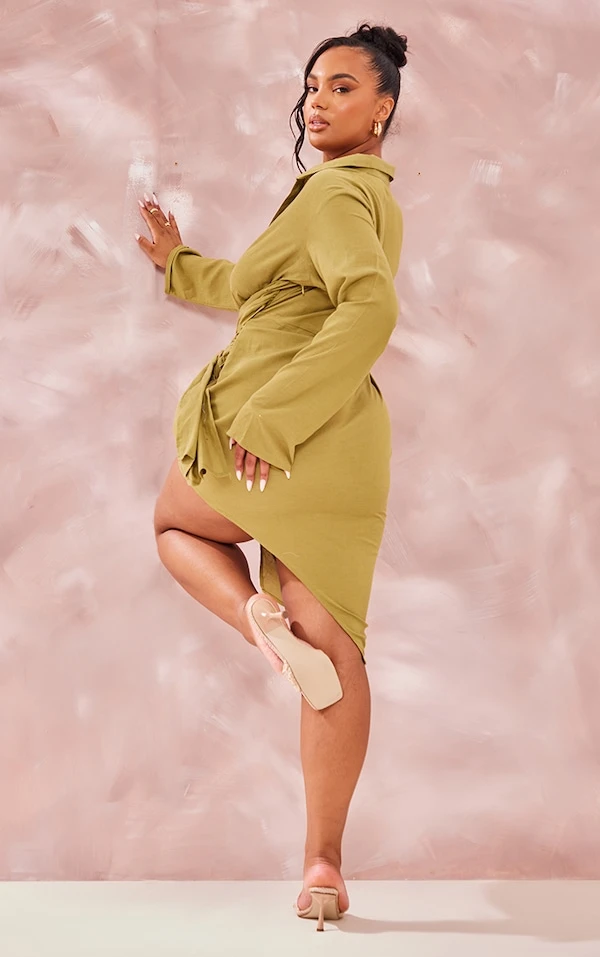 Plus Robe chemise en effet lin vert olive à liens autour de la taille
