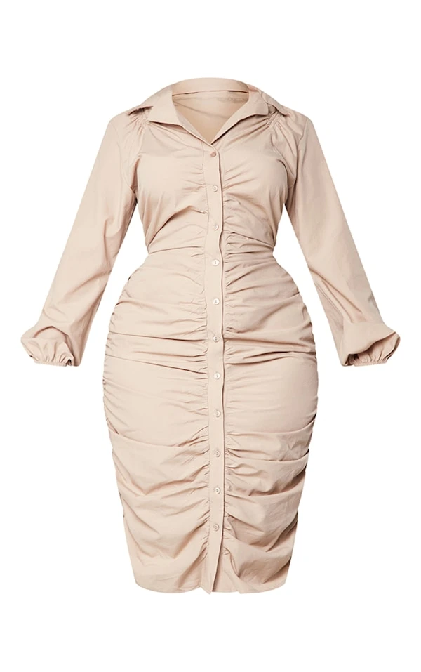 Plus Robe chemise mi-longue gris pierre en popeline froncée à l’avant