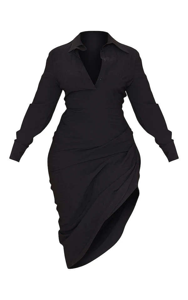 Plus Robe chemise mi-longue noire texturée à côté froncé