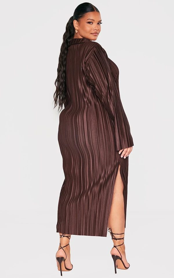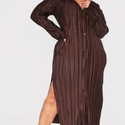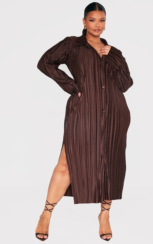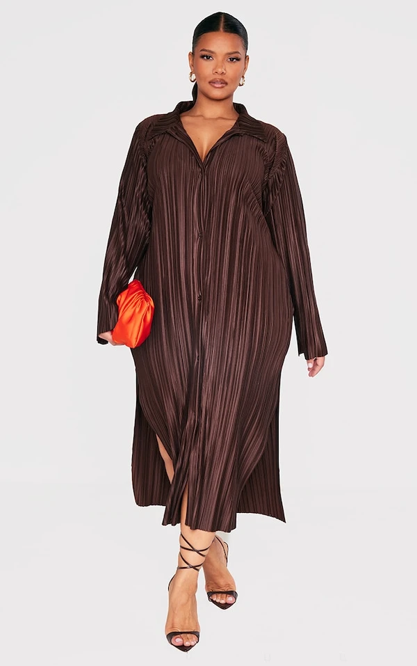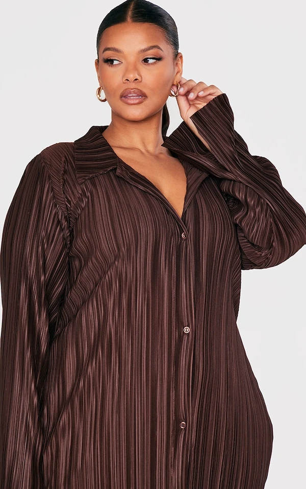 Plus Robe chemise mi-longue oversize chocolat plissée