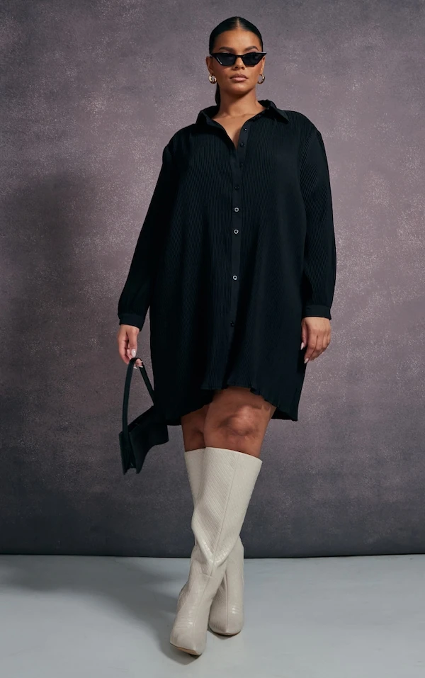 Pratique et très stylée cette robe au style chemise ! On adore sa matière plissée très flatteuse, son coloris noir qui va avec tout et sa coupe oversize magnifique et cosy. Plus qu’à enfiler des talons lacés et quelques accessoires shiny. Vous êtes super belle.