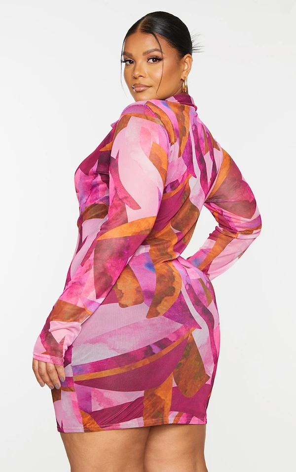 Plus Robe chemise rose imprimé abstrait en mesh boutonnée