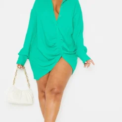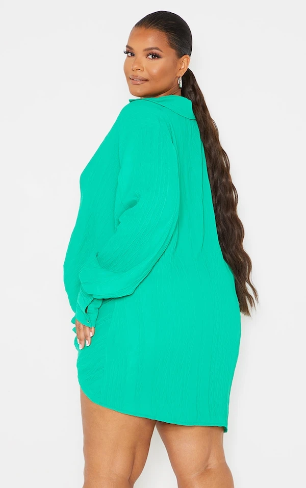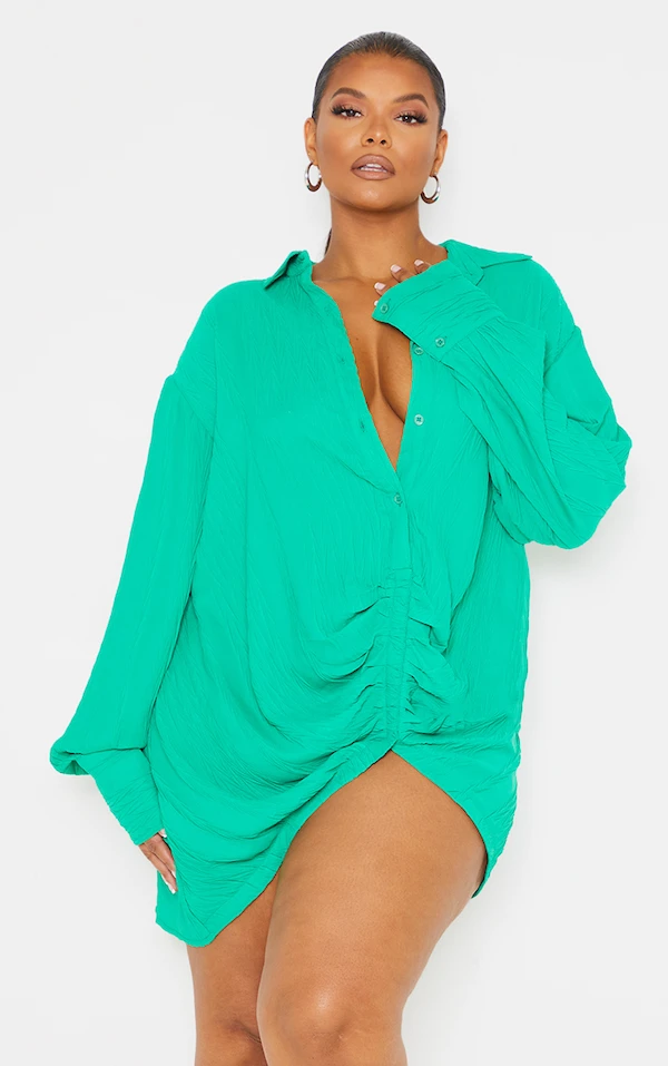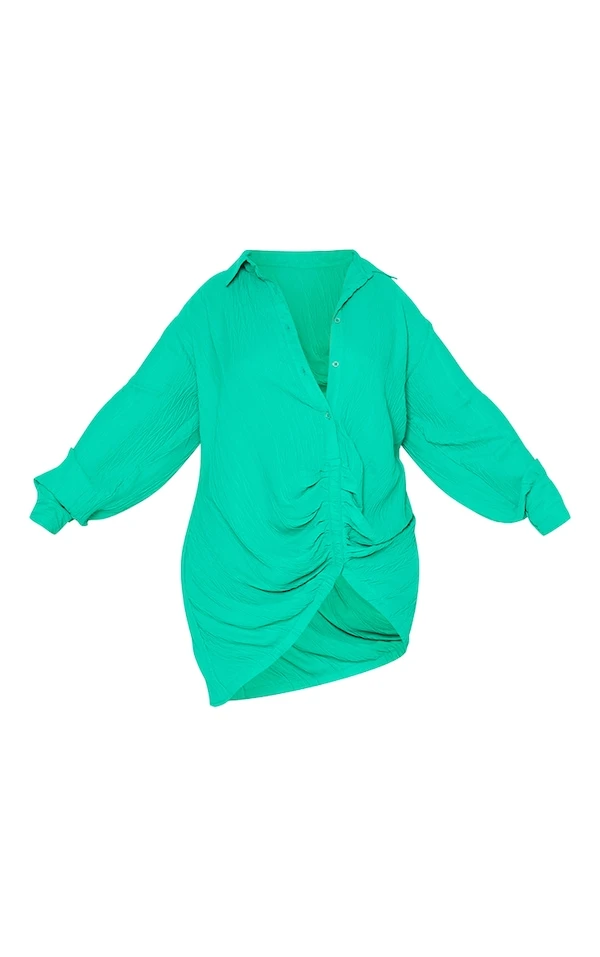 Plus Robe chemise texturée verte à détail drapé et manches longues