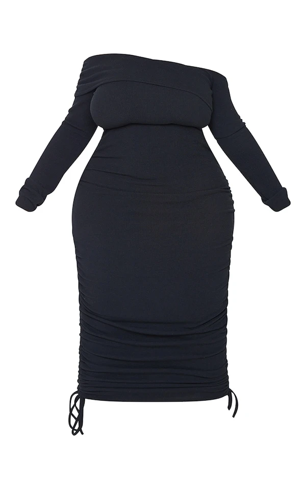 Plus Robe côtelée noire froncée sur les côtés à col bardot