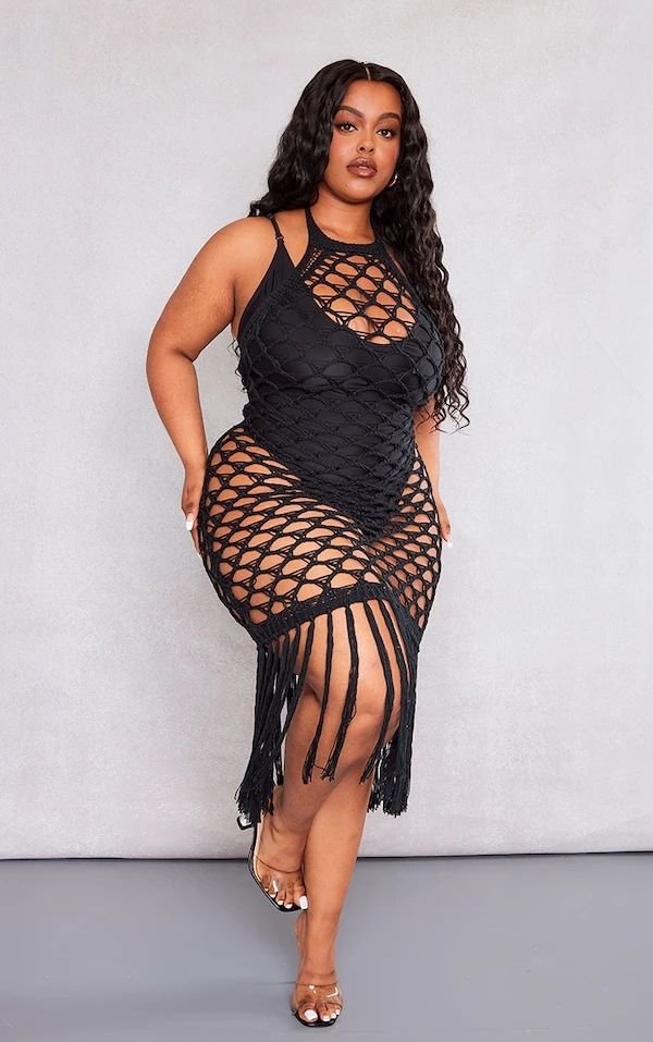 Plus Robe de plage en maille tricot noire détail franges à dos nu