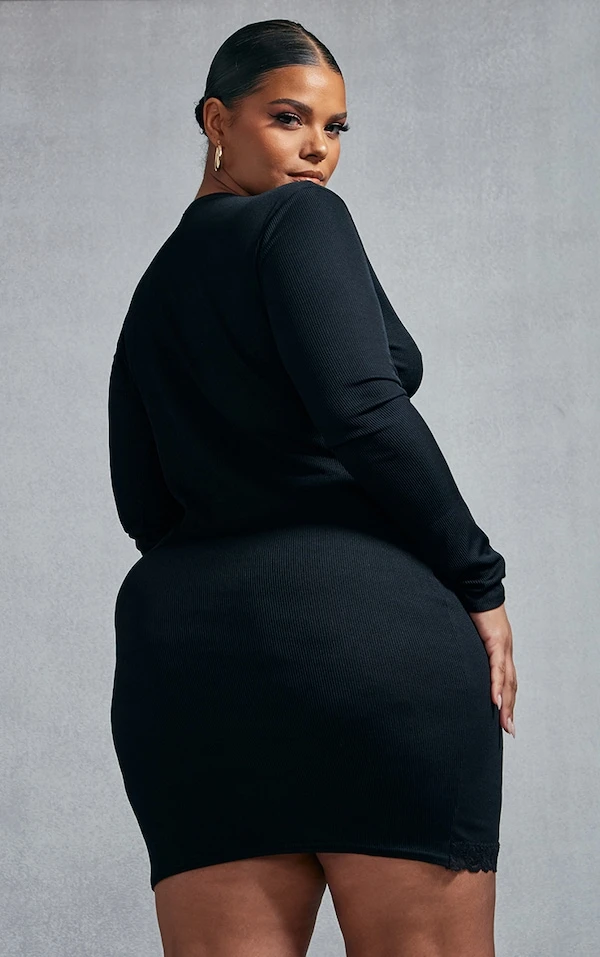 Plus Robe droite côtelée noire à détail dentelle et ourlet fendu