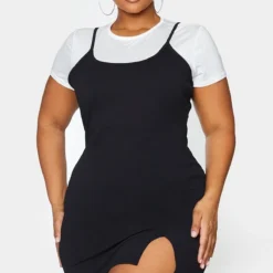 Love sur cette robe droite ! On adore sa coupe fendue, sa base tee-shirt et ses bretelles fines, le tout dans un coloris noir profond. On la porte avec des baskets et go !