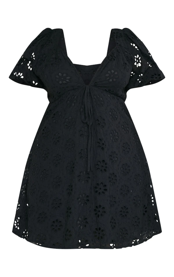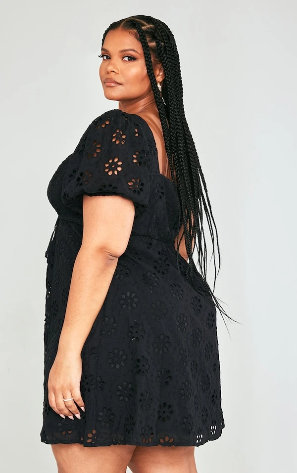 Plus Robe droite noire en broderie anglaise à manches bouffantes